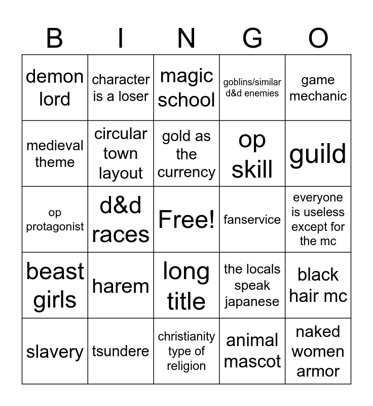 This bingo card has a free space and 24 words: harem, tsundere, gold as the currency, slavery, game mechanic, demon lord, medieval theme, character is a loser, fanservice, long title, op skill, op protagonist, the locals speak japanese, black hair mc, circular town layout, animal mascot, everyone is useless except for the mc, magic school, guild, d&d races, naked women armor, beast girls, goblins/similar d&d enemies and christianity type of religion.