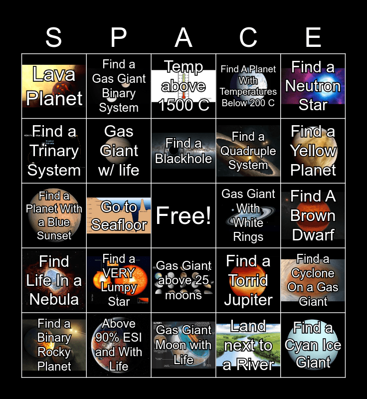 This bingo card has 30 images, a free space and 30 words: Above 90% ESI and With Life, Habitable Planet with Rings, Go to Seafloor, Land In a Canyon, Lava Planet, Temp above 1500 C, Gas Giant w/ life, Gas Giant above 25 moons, Gas Giant With White Rings, Gas Giant Moon with Life, Find A Brown Dwarf, Find a Cyan Ice Giant, Land next to a River, Find an Active Volcano, Find a Yellow Planet, Find 4 or 5 Rocky Planets in the Same System, Find a Torrid Jupiter, Find Life In a Nebula, Find a VERY Lumpy Star, Find a Neutron Star, Find a Planet With a Blue Sunset, Find a Red Planet, Find a Gas Giant Binary System, Find a Quadruple System, Find a Trinary System, Find A Planet With Temperatures Below 200 C, Find a Cyclone On a Gas Giant, Find a Binary Rocky Planet, Find a Blackhole and Find a Supermassive Black Hole.