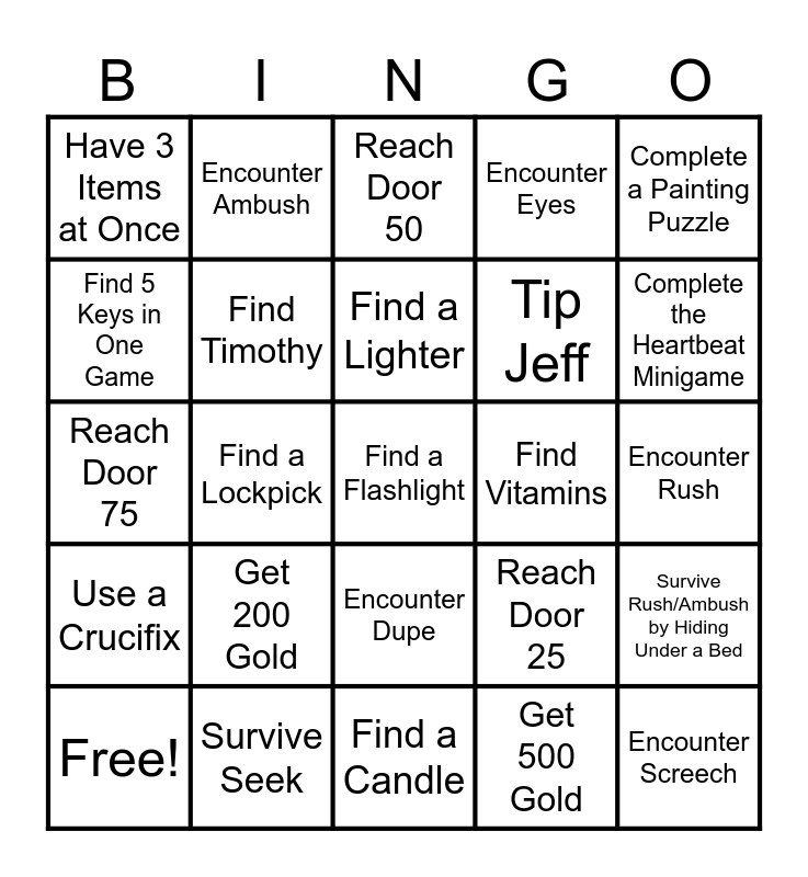 This bingo card has 27 words: Reach Door 25, Encounter Screech, Tip Jeff, Find a Candle, Find 5 Keys in One Game, Reach Door 50, Encounter Ambush, Use a Crucifix, Find Vitamins, Survive Rush/Ambush by Hiding Under a Bed, Reach Door 75, Encounter Eyes, Free!, Survive Seek, Complete the Heartbeat Minigame, Reach Door 100, Find Timothy, Find a Lighter, Get 200 Gold, Have 3 Items at Once, Encounter Rush, Get 500 Gold, Find a Lockpick, Find a Flashlight, Encounter Dupe, Complete a Painting Puzzle and Clear a Dark Room Without a Light Source.