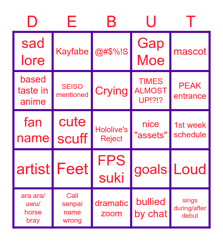This bingo card has a free space and 29 words: ara ara/ uwu/ horse bray, nervous laugh, cute scuff, "is my volume good?", sad lore, @#$%!S, SEISO mentioned, Feet, nice "assets", Call senpai name wrong, 1st week schedule, sings during/after debut, dramatic zoom, bullied by chat, PEAK entrance, hype BGM, FPS suki, artist, mascot, fan name, goals, chat tskr, TIMES ALMOST UP!?!?, based taste in anime, Gap Moe, Kayfabe, Loud, Crying and Hime.
