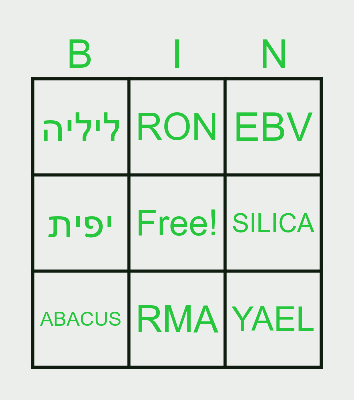 This bingo card has a free space and 11 words: SAP, RMA, YAEL, ABACUS, RON, EBV, SILICA, ASIC, יפית, ליליה and שירי.