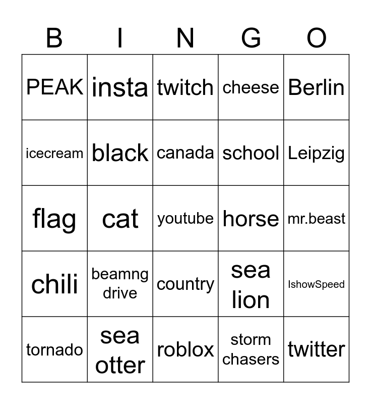 This bingo card has a free space and 24 words: beamng drive, sea otter, canada, tornado, Berlin, PEAK, icecream, insta, horse, country, school, flag, sea lion, IshowSpeed, black, storm chasers, mr.beast, twitch, Leipzig, cat, twitter, chili, cheese and roblox.