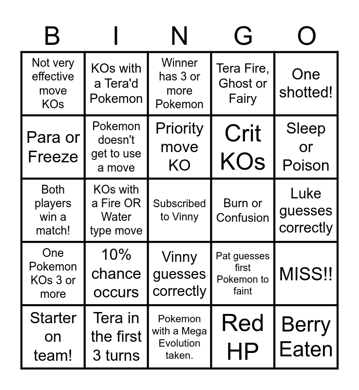 This bingo card has a free space and 24 words: 10% chance occurs, Tera in the first 3 turns, Priority move KO, Starter on team!, One shotted!, Not very effective move KOs, Para or Freeze, KOs with a Tera'd Pokemon, Burn or Confusion, Vinny guesses correctly, Crit KOs, Both players win a match!, Pat guesses first Pokemon to faint, MISS!!, Pokemon doesn't get to use a move, Red HP, Luke guesses correctly, Winner has 3 or more Pokemon, Sleep or Poison, KOs with a Fire OR Water type move, Berry Eaten, One Pokemon KOs 3 or more, Tera Fire, Ghost or Fairy and Pokemon with a Mega Evolution taken..