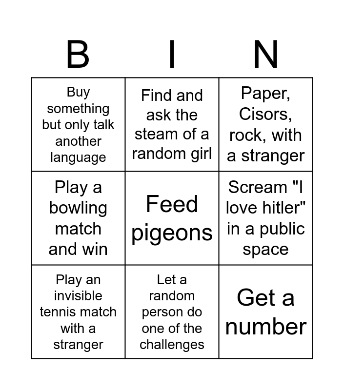 This bingo card has a free space and 8 words: Scream "I love hitler" in a public space, Paper, Cisors, rock, with a stranger, Find and ask the steam of a random girl, Play an invisible tennis match with a stranger, Buy something but only talk another language, Get a number, Play a bowling match and win and Let a random person do one of the challenges.