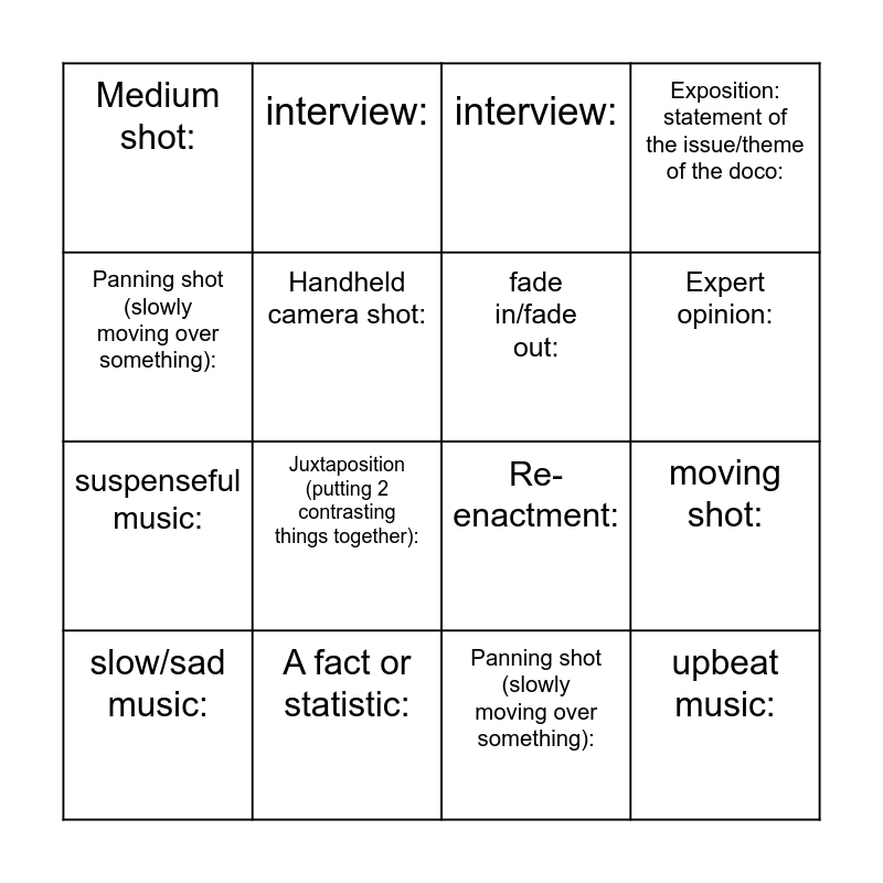 This bingo card has 28 words: archival footage:, voice over:, suspenseful music:, montage:, Handheld camera shot:, interview:, interview:, upbeat music:, A fact or statistic:, A fact or statistic:, Re-enactment:, Exposition: statement of the issue/theme of the doco:, close-up shot:, wide shot:, Juxtaposition (putting 2 contrasting things together):, Use of silence:, archival footage:, fade in/fade out:, Expert opinion:, Text on screen (not subtitles), Medium shot:, close up shot:, slow/sad music:, moving shot:, Panning shot (slowly moving over something):, voice over:, Panning shot (slowly moving over something): and archival footage:.