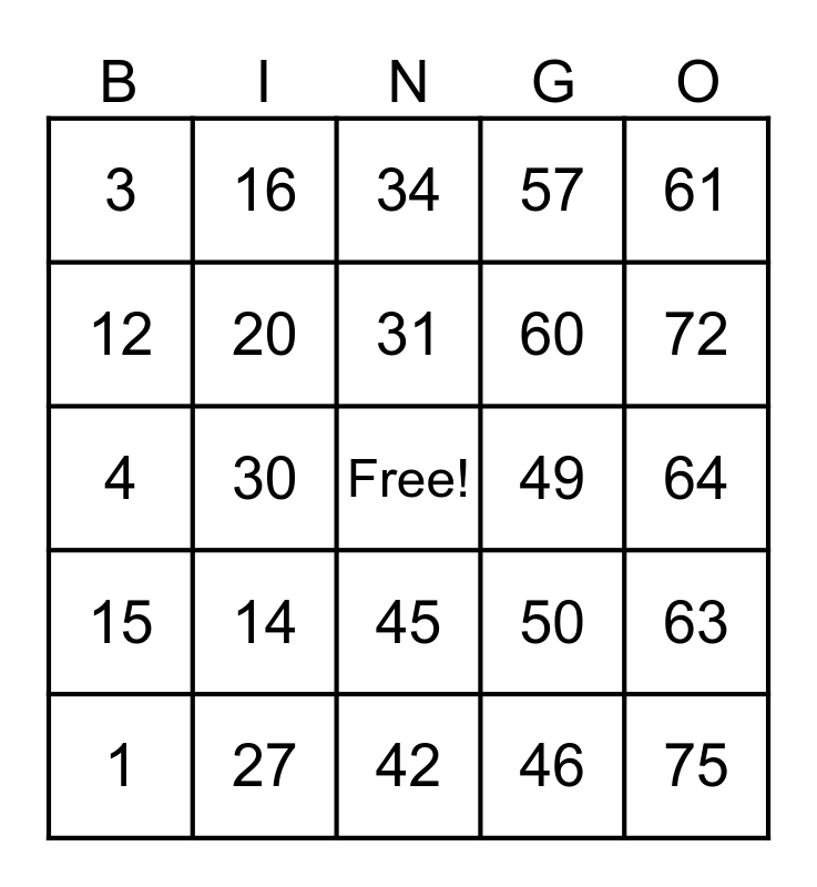 This bingo card has a free space and 24 words: 1, 14, 31, 46, 61, 3, 16, 34, 49, 64, 4, 20, 50, 63, 12, 27, 42, 57, 72, 15, 30, 45, 60 and 75.