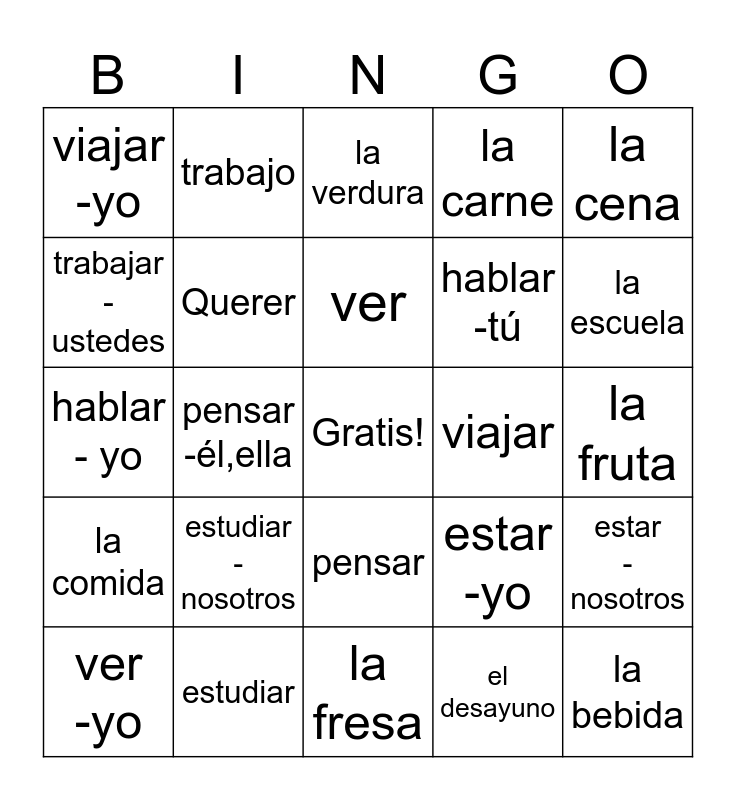 This bingo card has a free space and 24 words: estudiar -nosotros, estudiar, ver, ver -yo, la cena, viajar -yo, trabajar -ustedes, trabajo, viajar, pensar, hablar -tú, hablar - yo, estar -yo, estar -nosotros, Querer, el desayuno, la fruta, la verdura, la escuela, pensar -él,ella, la bebida, la comida, la carne and la fresa.