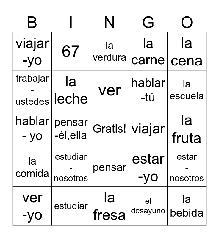 This bingo card has a free space and 24 words: estudiar -nosotros, estudiar, ver, ver -yo, la cena, viajar -yo, trabajar -ustedes, 67, viajar, pensar, hablar -tú, hablar - yo, estar -yo, estar -nosotros, la leche, el desayuno, la fruta, la verdura, la escuela, pensar -él,ella, la bebida, la comida, la carne and la fresa.