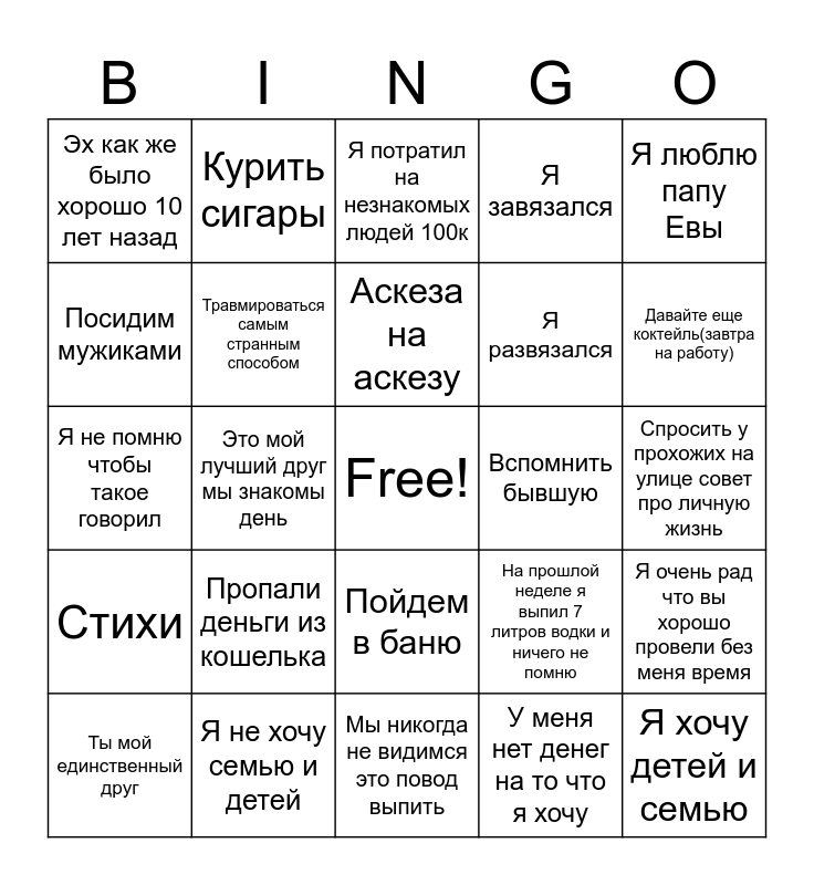 This bingo card has a free space and 24 words: Пропали деньги из кошелька, Я не хочу семью и детей, Аскеза на аскезу, Ты мой единственный друг, Я люблю папу Евы, Эх как же было хорошо 10 лет назад, Посидим мужиками, Курить сигары, Вспомнить бывшую, Пойдем в баню, Я развязался, Я не помню чтобы такое говорил, На прошлой неделе я выпил 7 литров водки и ничего не помню, Я очень рад что вы хорошо провели без меня время, Травмироваться самым странным способом, У меня нет денег на то что я хочу, Спросить у прохожих на улице совет про личную жизнь, Я потратил на незнакомых людей 100к, Давайте еще коктейль(завтра на работу), Это мой лучший друг мы знакомы день, Я хочу детей и семью, Стихи, Я завязался and Мы никогда не видимся это повод выпить.