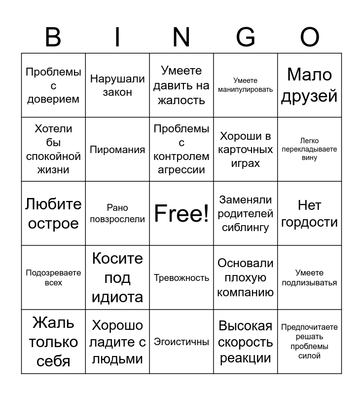 This bingo card has a free space and 24 words: Косите под идиота, Хорошо ладите с людьми, Проблемы с контролем агрессии, Жаль только себя, Мало друзей, Проблемы с доверием, Хотели бы спокойной жизни, Нарушали закон, Заменяли родителей сиблингу, Тревожность, Хороши в карточных играх, Любите острое, Основали плохую компанию, Умеете подлизыватья, Пиромания, Высокая скорость реакции, Нет гордости, Умеете давить на жалость, Легко перекладываете вину, Рано повзрослели, Предпочитаете решать проблемы силой, Подозреваете всех, Умеете манипулировать and Эгоистичны.