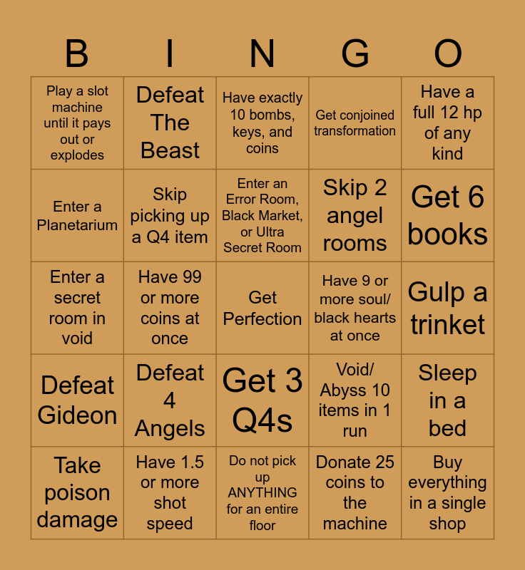 This bingo card has 48 words: Get an item from a NON-TINTED grid item, Get Perfection, Die in the Mega Satan fight, Do not pick up ANYTHING for an entire floor, Defeat 4 Angels, Have 6 or more Red heart Containers at once, Defeat The Beast, Have 0.7 or less speed, Enter a Planetarium, Blow up 7 tinted rocks or 1 super secret rock, Skip picking up a Q4 item, Get conjoined transformation, Sleep in a bed, Void/ Abyss 10 items in 1 run, Revive (not Laz), Win 2 runs, Enter an Error Room, Black Market, or Ultra Secret Room, Have 9 or more soul/ black hearts at once, Die to picking up a devil deal item, Have a full 12 hp of any kind, Have 99 or more coins at once, Donate 25 coins to the machine, Play a slot machine until it pays out or explodes, Skip 2 angel rooms, Get seraphim transformation, Get 6 books, Take poison damage, Defeat a boss without shooting, Get 3 Q4s, Defeat Gideon, Defeat Hush, Complete boss rush, Get an item in a secret room, Destroy 10 keepers, Have 1.5 or more shot speed, Defeat delirium, Reroll your entire build, Gulp a trinket, Have a broken heart, Roll the same pedestal 5 times, Get a Bomb, Charge, or Rotten Beggar to pay out, Buy everything in a single shop, Have exactly 10 bombs, keys, and coins, Have 2 or more cube of meat/ ball of bandages, Enter a secret room in void, Get both knife pieces, Get leviathan transformation and Get bookworm transformation.