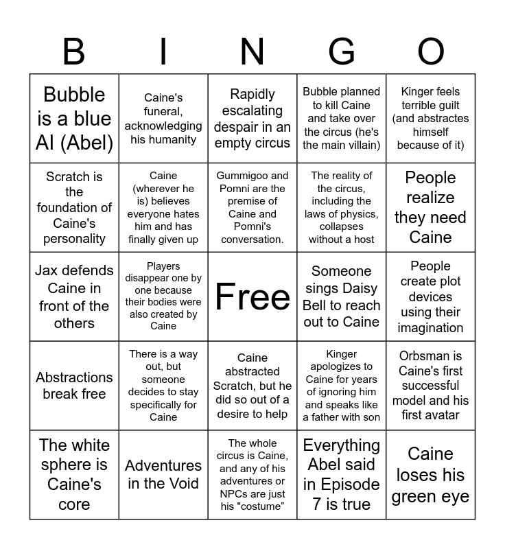 This bingo card has a free space and 24 words: There is a way out, but someone decides to stay specifically for Caine, Adventures in the Void, Gummigoo and Pomni are the premise of Caine and Pomni's conversation., The white sphere is Caine's core, Kinger feels terrible guilt (and abstractes himself because of it), Bubble is a blue AI (Abel), Scratch is the foundation of Caine's personality, Caine's funeral, acknowledging his humanity, Someone sings Daisy Bell to reach out to Caine, Caine abstracted Scratch, but he did so out of a desire to help, The reality of the circus, including the laws of physics, collapses without a host, Jax defends Caine in front of the others, Kinger apologizes to Caine for years of ignoring him and speaks like a father with son, Orbsman is Caine's first successful model and his first avatar, Caine (wherever he is) believes everyone hates him and has finally given up, Everything Abel said in Episode 7 is true, People create plot devices using their imagination, Rapidly escalating despair in an empty circus, People realize they need Caine, Players disappear one by one because their bodies were also created by Caine, Caine loses his green eye, Abstractions break free, Bubble planned to kill Caine and take over the circus (he's the main villain) and The whole circus is Caine, and any of his adventures or NPCs are just his "costume”.
