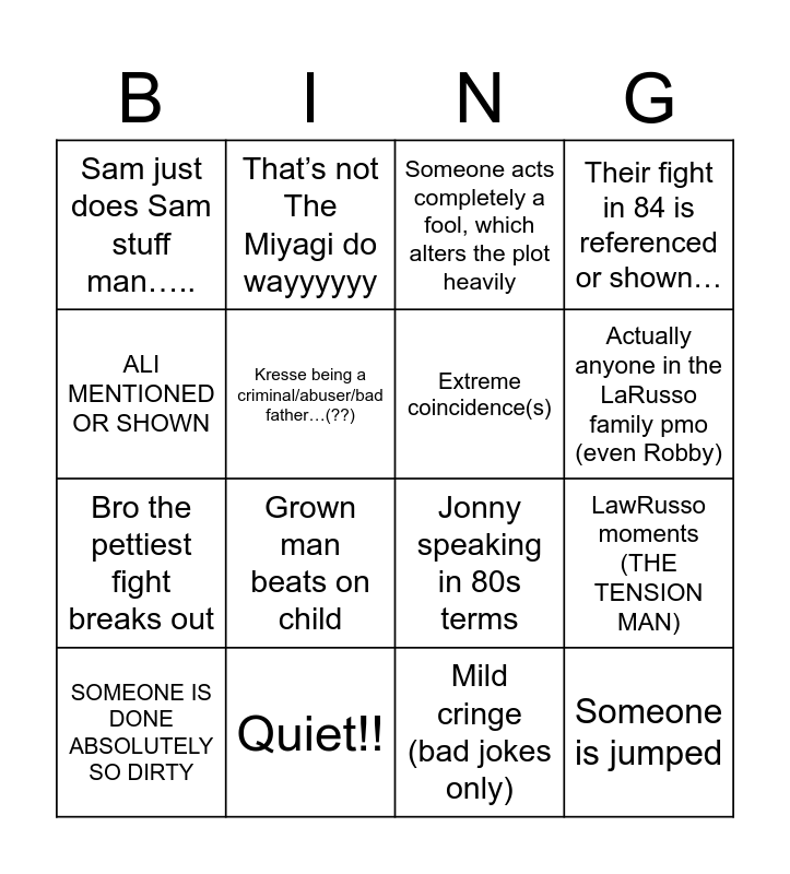 This bingo card has 21 words: Quiet!!, Cobra Kai never dies, That’s not The Miyagi do wayyyyyy, Robby rages, Mild cringe (bad jokes only), Extreme coincidence(s), Sam just does Sam stuff man….., Someone acts completely a fool, which alters the plot heavily, Jonny speaking in 80s terms, Actually anyone in the LaRusso family pmo (even Robby), Bro the pettiest fight breaks out, Their fight in 84 is referenced or shown…, Someone is jumped, They do the actual impossible, Kresse being a criminal/abuser/bad father…(??), Johnny is drinking a white claw, SOMEONE IS DONE ABSOLUTELY SO DIRTY, Grown man beats on child, ALI MENTIONED OR SHOWN, LawRusso moments (THE TENSION MAN) and A couple breaks up.