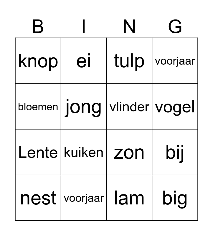 This bingo card has 18 words: kuiken, big, tulp, knop, zon, voorjaar, nest, ei, vogel, Lente, lam, bloemen, bij, jong, vlinder, bollen, voorjaar and narcis.