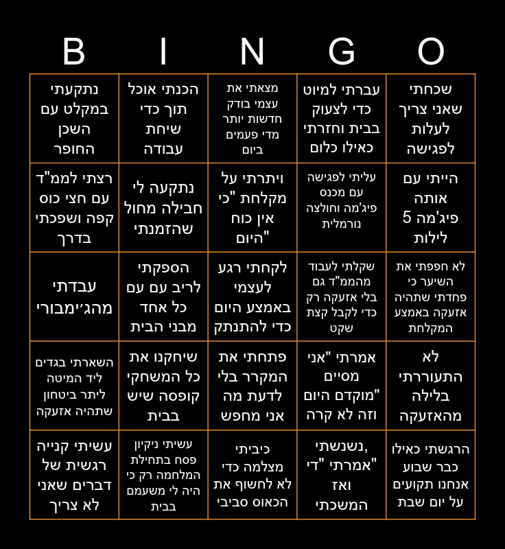 This bingo card has 50 words: עצרתי שיחת עבודה בגלל אזעקה, עליתי לפגישה עם מכנס פיג'מה וחולצה נורמלית, פתחתי מצלמה רק לשנייה כדי שיראו שאני ״שם״, הספקתי להכין אוכל בין התראה לאזעקה, עבדתי מהג׳ימבורי, לקחתי את הלפטופ לממ"ד "רק לשתי דקות" ונשארתי לעבוד, מצאתי את עצמי בודק חדשות יותר מדי פעמים ביום, אני נכנס לאינסטגרם להתעדכן ומוצא את עצמי גולל יותר משעה, הייתי עם אותה פיג'מה 5 לילות, לא החלפתי מפיג׳מה לבגדים רגילים 5 ימים, הכנתי אוכל תוך כדי שיחת עבודה, ויתרתי על מקלחת "כי אין כוח היום", אמרתי "אני מסיים מוקדם היום" וזה לא קרה, הרגשתי כאילו כבר שבוע אנחנו תקועים על יום שבת, שתיתי יותר קפה מהרגיל, שכחתי איזה יום היום, לקחתי רגע לעצמי באמצע היום כדי להתנתק, שקלתי לעבוד מהממ"ד גם בלי אזעקה רק כדי לקבל קצת שקט, תפסה אותי אזעקה באמצע המקלחת, נתקעתי במקלט עם השכן החופר, הספקתי לריב עם עם כל אחד מבני הבית, כיביתי מצלמה כדי לא לחשוף את הכאוס סביבי, עברתי למיוט כדי לצעוק בבית וחזרתי כאילו כלום, לא חפפתי את השיער כי פחדתי שתהיה אזעקה באמצע המקלחת, נקלעתי לשיחה במקלט ב4 בבוקר, שיחקנו את כל המשחקי קופסה שיש בבית, פתחתי את המקרר בלי לדעת מה אני מחפש, התעוררתי כמה פעמים בלילה בלי סיבה רק כי חשבתי שאולי תהיה אזעקה, שכחתי שאני צריך לעלות לפגישה, השארתי בגדים ליד המיטה ליתר ביטחון שתהיה אזעקה, הצלחתי לישון יותר מ12 שעות, התחלתי וסיימתי לראות סדרה חדשה, יצאתי למסיבת פורים במקלט, אירחתי חברים/משפחה שאין להם מקלט בבית, תפסה אותי אזעקה בנסיעה, עשיתי ניקיון פסח בתחילת המלחמה רק כי היה לי משעמם בבית, לא קמתי לפגישה, עליתי לפגישה מהמיטה, נשארתי על מיוט כל הפגישה ושכחתי שאני בכלל שם, רצתי לממ"ד עם חצי כוס קפה ושפכתי בדרך, לקחתי איתי יותר מדי דברים לממ"ד "למקרה ש…", יצאתי מהממ"ד ולא זכרתי מה עשיתי לפני, נשנשתי, אמרתי "די" ואז המשכתי, הנהנתי בפגישה למרות שלא הייתי מרוכז, עשיתי קנייה רגשית של דברים שאני לא צריך, נתקעה לי חבילה מחול שהזמנתי, התבטלה לי טיסה לחול, נתקעתי בחול, לא התעוררתי בלילה מהאזעקה and עליתי לדיילי לפני שצחצחתי שיניים.