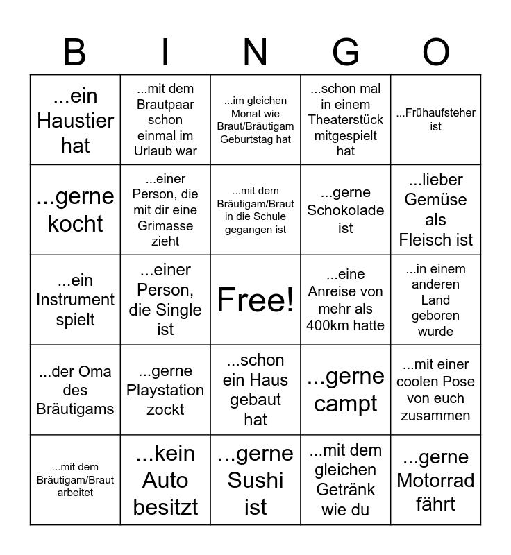 This bingo card has a free space and 33 words: ...den Schwestern des Brautpaares, ...die Eltern des Brautpaares, ...einer Person, die Single ist, ...drei Gästen, die eine Brille tragen, ...der Oma des Bräutigams, ...einer Person, die mit dir eine Grimasse zieht, ...Frühaufsteher ist, ...mit dem Bräutigam/Braut arbeitet, ...mit dem Brautpaar schon einmal im Urlaub war, ...schon verheiratet ist, ...mit dem Bräutigam/Braut in die Schule gegangen ist, ...im gleichen Monat wie Braut/Bräutigam Geburtstag hat, ...mindestens 2 Tattoos besitzt, ...Linkshänger ist, ...eine Anreise von mehr als 400km hatte, ...lieber Gemüse als Fleisch ist, ...kein Auto besitzt, ...ein Instrument spielt, ...gerne Playstation zockt, ...gerne campt, ...schon ein Haus gebaut hat, ...den gleichen Nachnamen (alt od. neu) wie die Braut hat, ...ein Haustier hat, ...in einem anderen Land geboren wurde, ...gerne Sushi ist, ...gerne Motorrad fährt, ...schon mal in einem Theaterstück mitgespielt hat, ...gerne Schokolade ist, ...gerne kocht, ...mit einer coolen Pose von euch zusammen, ...den du neu kennengelernt hast, ...mit dem gleichen Getränk wie du and ...auf der Tanzfläche von euch.