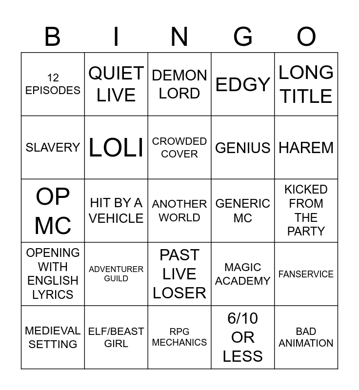 This bingo card has a free space and 24 words: ADVENTURER GUILD, ELF/BEAST GIRL, CROWDED COVER, MEDIEVAL SETTING, LONG TITLE, 12 EPISODES, SLAVERY, QUIET LIVE, GENERIC MC, PAST LIVE LOSER, GENIUS, OP MC, MAGIC ACADEMY, FANSERVICE, LOLI, 6/10 OR LESS, KICKED FROM THE PARTY, DEMON LORD, HAREM, HIT BY A VEHICLE, BAD ANIMATION, OPENING WITH ENGLISH LYRICS, EDGY and RPG MECHANICS.
