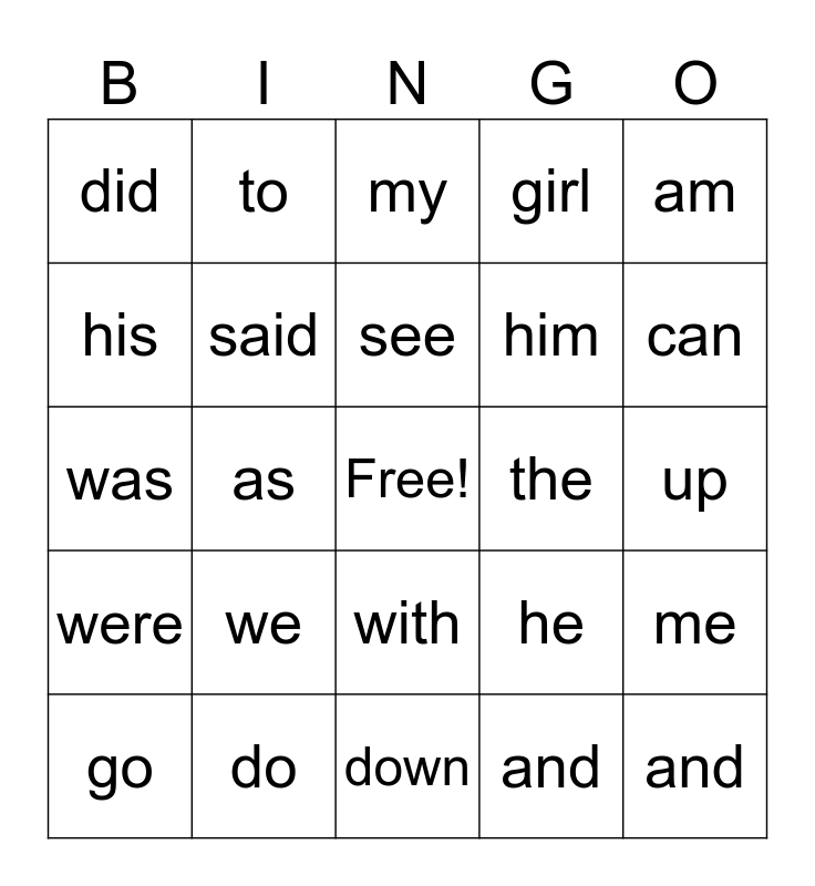 This bingo card has a free space and 53 words: I, and, he, and, we, of, to, in, his, for, said, boy, me, he, like, go, see, the, will, am, as, is, him, did, that, do, play, you, had, can, has, be, at, have, it, on, girl, down, my, little, out, but, up, all, look, with, her, what, was, were, they, love and she.