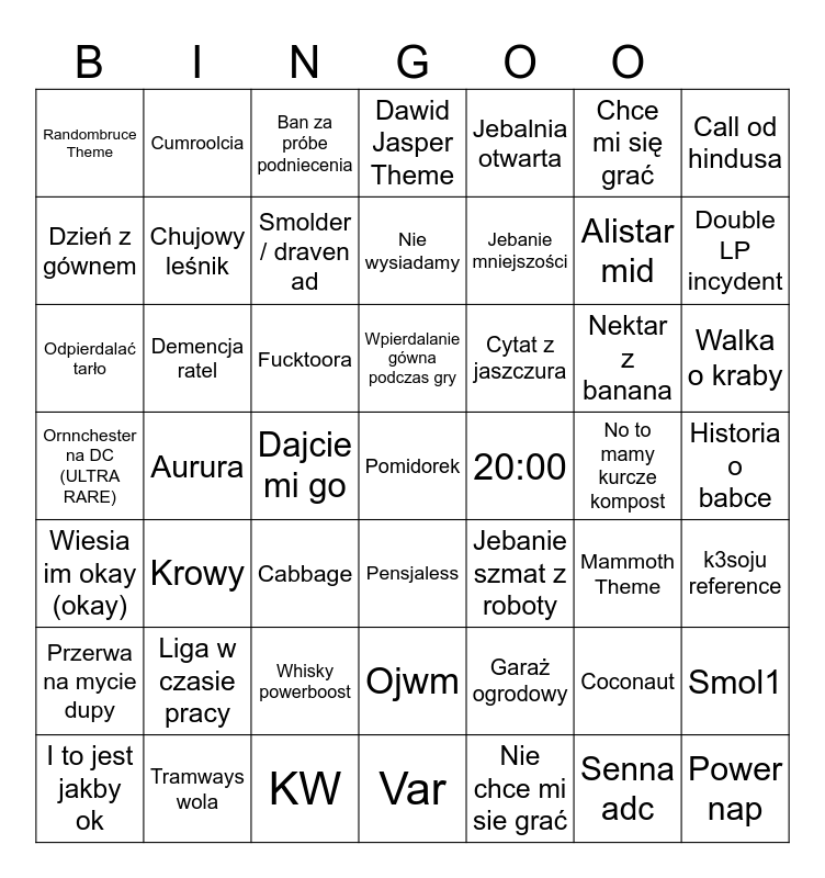 This bingo card has 49 words: Coconaut, Alistar mid, Nie chce mi sie grać, Aurura, Fucktoora, Historia o babce, Cumroolcia, KW, Chce mi się grać, Pensjaless, Call od hindusa, Dawid Jasper Theme, Nektar z banana, Cytat z jaszczura, Liga w czasie pracy, No to mamy kurcze kompost, Dzień z gównem, Double LP incydent, Smol1, Jebalnia otwarta, Jebanie mniejszości, Dajcie mi go, Randombruce Theme, Chujowy leśnik, I to jest jakby ok, Smolder / draven ad, Walka o kraby, Tramways wola, Wpierdalanie gówna podczas gry, Demencja ratel, Power nap, 20:00, Przerwa na mycie dupy, Whisky powerboost, Ornnchester na DC (ULTRA RARE), Jebanie szmat z roboty, Mammoth Theme, k3soju reference, Odpierdalać tarło, Cabbage, Ojwm, Wiesia im okay (okay), Pomidorek, Var, Nie wysiadamy, Ban za próbe podniecenia, Garaż ogrodowy, Krowy and Senna adc.