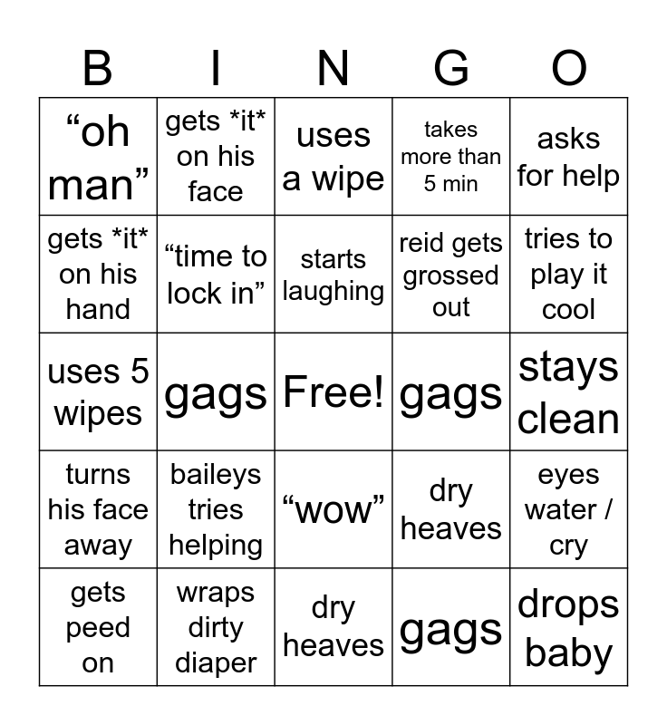This bingo card has a free space and 24 words: baileys tries helping, wraps dirty diaper, starts laughing, gets peed on, asks for help, “oh man”, gets *it* on his hand, gets *it* on his face, gags, “wow”, reid gets grossed out, uses 5 wipes, dry heaves, eyes water / cry, “time to lock in”, gags, stays clean, uses a wipe, tries to play it cool, gags, drops baby, turns his face away, takes more than 5 min and dry heaves.