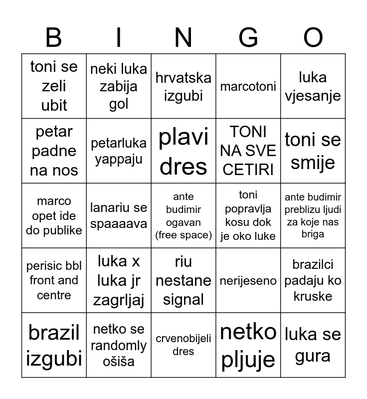 This bingo card has a free space and 34 words: jakic harrassa malog luku, netko pljuje, brazilci se krenu svadat, lukatoni !!!, perisic bbl front and centre, petarluka yappaju, luka vjesanje, brazil izgubi, neki luka zabija gol, nepotrebno skidanje majica, plavi dres, hrvatska izgubi, predobar gol s velike udaljenosti, luka sucic nije apsolutno beskoristan, toni popravlja kosu dok je oko luke, toni se smije, netko se randomly ošiša, marco opet ide do publike, luka x luka jr zagrljaj, nerijeseno, riu nestane signal, old man yaoi, toni se zeli ubit, ante budimir preblizu ljudi za koje nas briga, crvenobijeli dres, luka se gura, marcotoni, petarmartin doom se nastavlja, TONI NA SVE CETIRI, petar padne na nos, martinluka opet imaju interakciju, lanariu se spaaaava, brazilci padaju ko kruske and komentator se gubi.