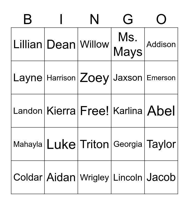 This bingo card has a free space and 24 words: Luke, Aidan, Zoey, Coldar, Addison, Lillian, Layne, Dean, Karlina, Triton, Jaxson, Landon, Georgia, Taylor, Harrison, Lincoln, Abel, Willow, Emerson, Kierra, Jacob, Mahayla, Ms. Mays and Wrigley.