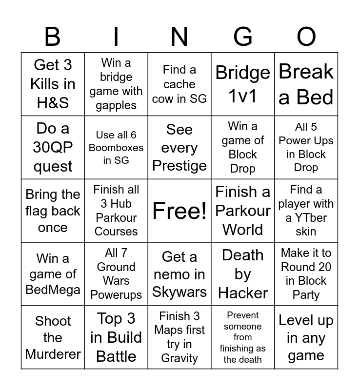 This bingo card has a free space and 24 words: All 7 Ground Wars Powerups, Top 3 in Build Battle, See every Prestige, Shoot the Murderer, Break a Bed, Get 3 Kills in H&S, Do a 30QP quest, Win a bridge game with gapples, Finish a Parkour World, Get a nemo in Skywars, Win a game of Block Drop, Bring the flag back once, Death by Hacker, Make it to Round 20 in Block Party, Use all 6 Boomboxes in SG, Prevent someone from finishing as the death, Find a player with a YTber skin, Find a cache cow in SG, All 5 Power Ups in Block Drop, Finish all 3 Hub Parkour Courses, Level up in any game, Win a game of BedMega, Bridge 1v1 and Finish 3 Maps first try in Gravity.