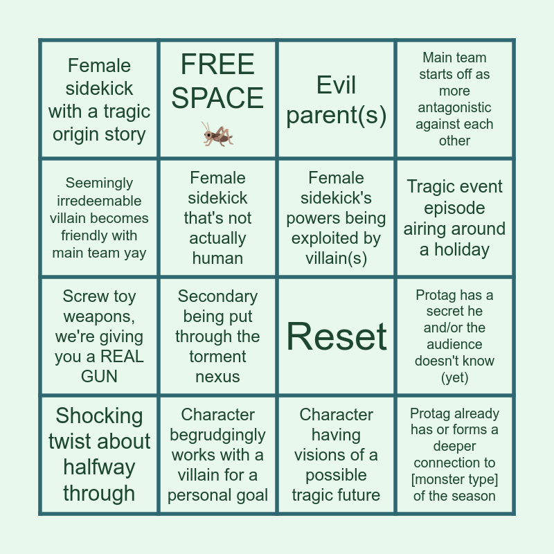 This bingo card has 16 words: Character begrudgingly works with a villain for a personal goal, Protag has a secret he and/or the audience doesn't know (yet), Evil parent(s), Female sidekick with a tragic origin story, Screw toy weapons, we're giving you a REAL GUN, FREE SPACE 🦗, Reset, Character having visions of a possible tragic future, Seemingly irredeemable villain becomes friendly with main team yay, Female sidekick that's not actually human, Shocking twist about halfway through, Main team starts off as more antagonistic against each other, Secondary being put through the torment nexus, Tragic event episode airing around a holiday, Female sidekick's powers being exploited by villain(s) and Protag already has or forms a deeper connection to [monster type] of the season.
