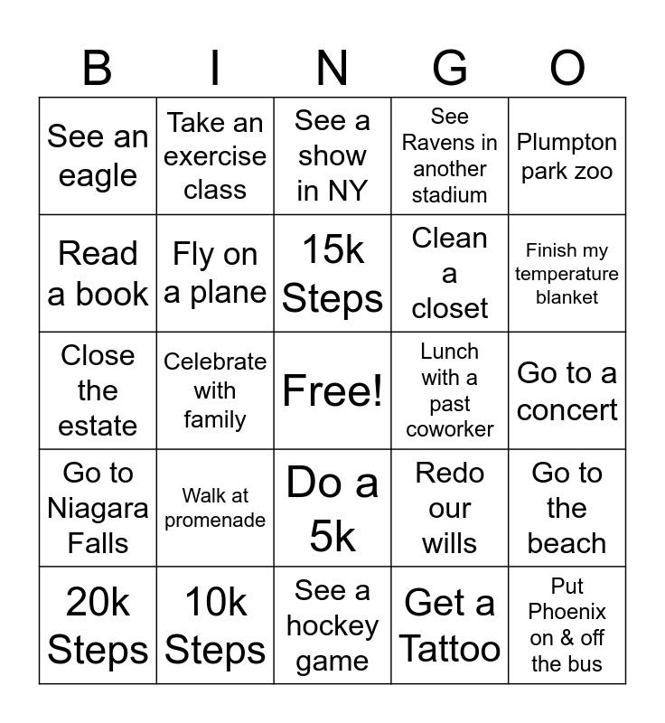 This bingo card has a free space and 24 words: Walk at promenade, 10k Steps, 15k Steps, 20k Steps, Plumpton park zoo, See an eagle, Read a book, Take an exercise class, Lunch with a past coworker, Do a 5k, Clean a closet, Close the estate, Redo our wills, Go to the beach, Fly on a plane, Get a Tattoo, Go to a concert, See a show in NY, Finish my temperature blanket, Celebrate with family, Put Phoenix on & off the bus, Go to Niagara Falls, See Ravens in another stadium and See a hockey game.