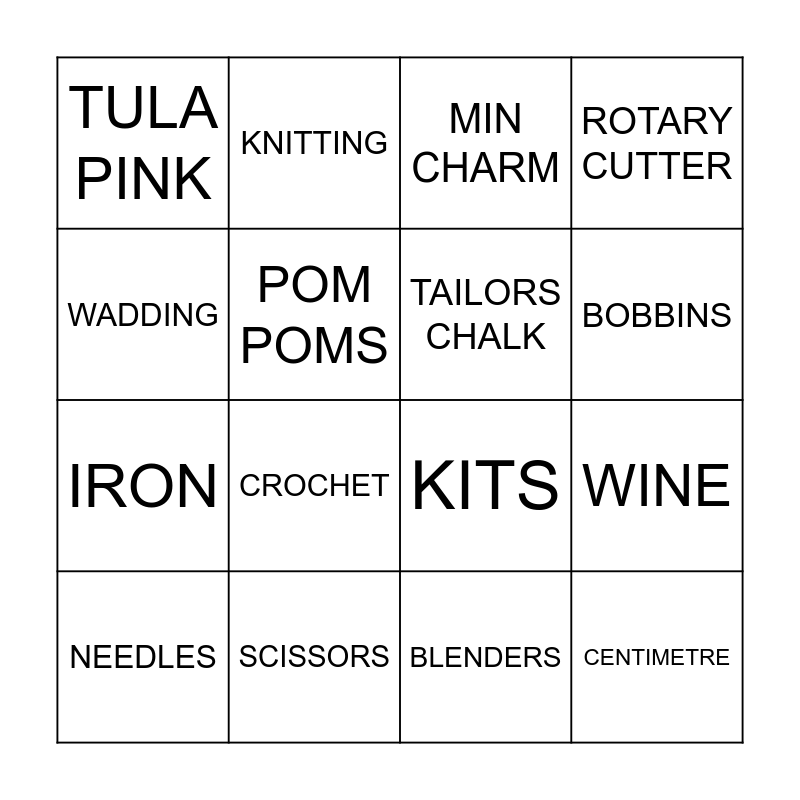 This bingo card has 44 words: PINS, NEEDLES, FABRIC, YARN, LAYER CAKE, JELLY ROLL, MIN CHARM, CHARM PACK, WADDING, STARCH, ROTARY CUTTER, SCISSORS, THIMBLE, SEWING MACHINE, CUTTING MAT, TEMPLATES, PATTERNS, KITS, THREAD, CROCHET, KNITTING, SEWING, MODA, TULA PINK, KAFFE FASSETT, BLENDERS, BINDING, BATIK, METRE, CENTIMETRE, INCH, STITCH MARKER, COFFEE, TEA, WINE, GIN, BUTTONS, FELT, BOBBINS, POM POMS, IRON, RIBBON, TAILORS CHALK and PENCIL.