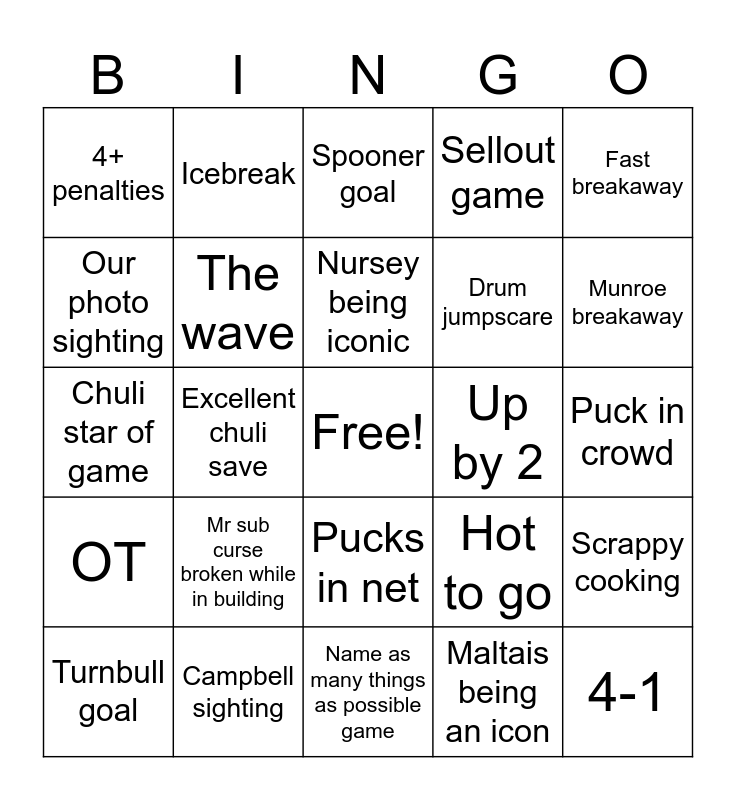 This bingo card has a free space and 24 words: Mr sub curse broken while in building, Campbell sighting, Nursey being iconic, Turnbull goal, Fast breakaway, 4+ penalties, Our photo sighting, Icebreak, Up by 2, Pucks in net, Drum jumpscare, Chuli star of game, Hot to go, Scrappy cooking, The wave, Maltais being an icon, Puck in crowd, Spooner goal, Munroe breakaway, Excellent chuli save, 4-1, OT, Sellout game and Name as many things as possible game.