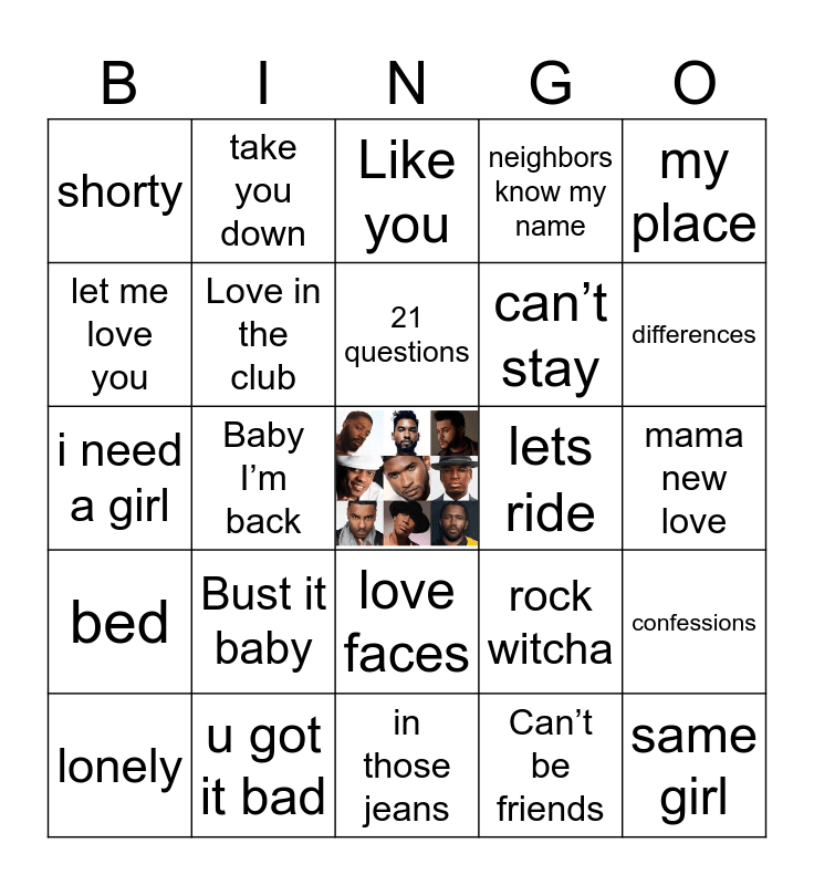 This bingo card has a free space and 54 words: I wanna know, bed, have my baby, cupid, love faces, say ah, neighbors know my name, touch, let me love you, just a friend, shorty, sexy love, u got it bad, lonely, my love, in those jeans, same girl, can’t stay, so Sick, mama new love, rock witcha, is love enough, lets ride, my place, yo, take you down, legs shakin, bump n grind, dive in, Can’t be friends, tell me, my boo, mesmerize, love don’t change, Like you, kiss me thru the phone, i need a girl, confessions, burn, Love in the club, sprung, one wish, bed, lovers and friends, Bust it baby, slow motion, how You gonna act like that, with you, 21 questions, Baby I’m back, differences, Im N love with a stripper, ill make love to you and end of the road.