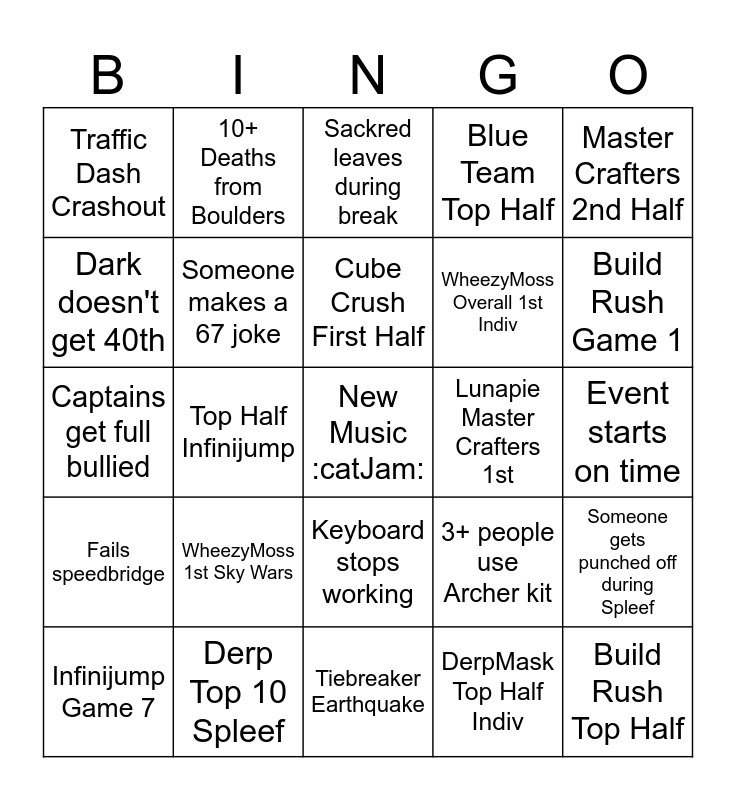 This bingo card has a free space and 24 words: Infinijump Game 7, WheezyMoss 1st Sky Wars, Cube Crush First Half, DerpMask Top Half Indiv, Master Crafters 2nd Half, Traffic Dash Crashout, 10+ Deaths from Boulders, Sackred leaves during break, Lunapie Master Crafters 1st, Event starts on time, Captains get full bullied, Someone makes a 67 joke, 3+ people use Archer kit, Someone gets punched off during Spleef, Dark doesn't get 40th, Derp Top 10 Spleef, Tiebreaker Earthquake, Blue Team Top Half, Build Rush Game 1, Fails speedbridge, Top Half Infinijump, Keyboard stops working, WheezyMoss Overall 1st Indiv and Build Rush Top Half.