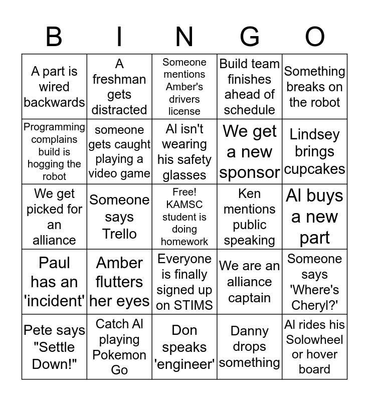 This bingo card has a free space and 24 words: Amber flutters her eyes, Catch Al playing Pokemon Go, Al isn't wearing his safety glasses, Pete says "Settle Down!", Something breaks on the robot, A part is wired backwards, Programming complains build is hogging the robot, A freshman gets distracted, Ken mentions public speaking, Everyone is finally signed up on STIMS, We get a new sponsor, We get picked for an alliance, We are an alliance captain, Someone says 'Where's Cheryl?', someone gets caught playing a video game, Danny drops something, Al buys a new part, Someone mentions Amber's drivers license, Lindsey brings cupcakes, Someone says Trello, Al rides his Solowheel or hover board, Paul has an 'incident', Build team finishes ahead of schedule and Don speaks 'engineer'.