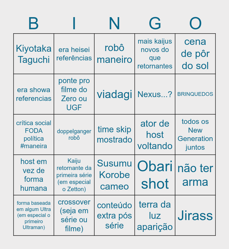 This bingo card has a free space and 24 words: Kaiju retornante da primeira série (em especial o Zetton), crossover (seja em série ou filme), viadagi, forma baseada em algum Ultra (em especial o primeiro Ultraman), cena de pôr do sol, Kiyotaka Taguchi, era showa referencias, era heisei referências, ator de host voltando, Susumu Korobe cameo, Nexus...?, crítica social FODA política #maneira, Obari shot, não ter arma, ponte pro filme do Zero ou UGF, terra da luz aparição, todos os New Generation juntos, robô maneiro, BRINQUEDOS, doppelganger robô, Jirass, host em vez de forma humana, mais kaijus novos do que retornantes and conteúdo extra pós série.