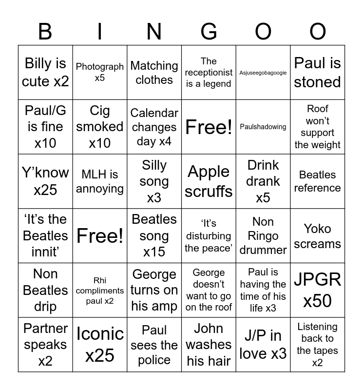 This bingo card has 36 words: George doesn’t want to go on the roof, George turns on his amp, John washes his hair, Paul/G is fine x10, ‘It’s the Beatles innit’, Apple scruffs, Cig smoked x10, Paul sees the police, Asjuseegobagoogie, Paul is having the time of his life x3, Roof won’t support the weight, The receptionist is a legend, JPGR x50, MLH is annoying, Free!, Billy is cute x2, Non Beatles drip, Drink drank x5, Y’know x25, Matching clothes, Silly song x3, Free!, ‘It’s disturbing the peace’, Beatles song x15, Non Ringo drummer, Photograph x5, Paulshadowing, Iconic x25, Calendar changes day x4, Paul is stoned, Listening back to the tapes x2, Partner speaks x2, Yoko screams, Beatles reference, Rhi compliments paul x2 and J/P in love x3.