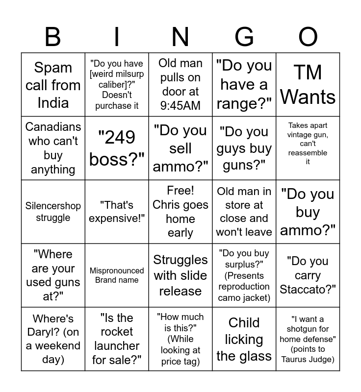 This bingo card has a free space and 24 words: Mispronounced Brand name, "Is the rocket launcher for sale?", "Do you sell ammo?", Where's Daryl? (on a weekend day), TM Wants, Spam call from India, Canadians who can't buy anything, "Do you have [weird milsurp caliber]?" Doesn't purchase it, Old man in store at close and won't leave, Struggles with slide release, "Do you guys buy guns?", Silencershop struggle, "Do you buy surplus?" (Presents reproduction camo jacket), "Do you carry Staccato?", "249 boss?", Child licking the glass, "Do you buy ammo?", Old man pulls on door at 9:45AM, Takes apart vintage gun, can't reassemble it, "That's expensive!", "I want a shotgun for home defense" (points to Taurus Judge), "Where are your used guns at?", "Do you have a range?" and "How much is this?" (While looking at price tag).