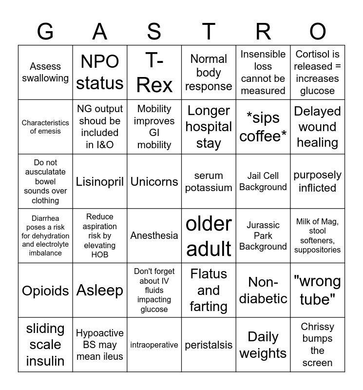 This bingo card has 48 words: The Office background, Do not ausculatate bowel sounds over clothing, Spongebob Squarepants Background, Jurassic Park Background, Jail Cell Background, Flatus and farting, NPO status, Assess skin turgor and mucous membranes, Cortisol is released = increases glucose, Hypoactive BS may mean ileus, Characteristics of emesis, Normal body response, Reduce aspiration risk by elevating HOB, Diarrhea poses a risk for dehydration and electrolyte imbalance, Chrissy bumps the screen, Don't forget about IV fluids impacting glucose, NG output shoud be included in I&O, Lisinopril, Free!, Insensible loss cannot be measured, Delayed wound healing, Milk of Mag, stool softeners, suppositories, Assess swallowing, Mobility improves GI mobility, Talking with her hands, Longer hospital stay, Anesthesia, increasedd risk for infection, purposely inflicted, serum potassium, BUN, Asleep, Daily weights, volume deficit, older adult, intraoperative, peristalsis, Unicorns, sliding scale insulin, N/V/D, Non-diabetic, Opioids, T-Rex, (dog barking in the background), *sips coffee*, Diet Coke reference, "wrong tube" and emergency surgery.