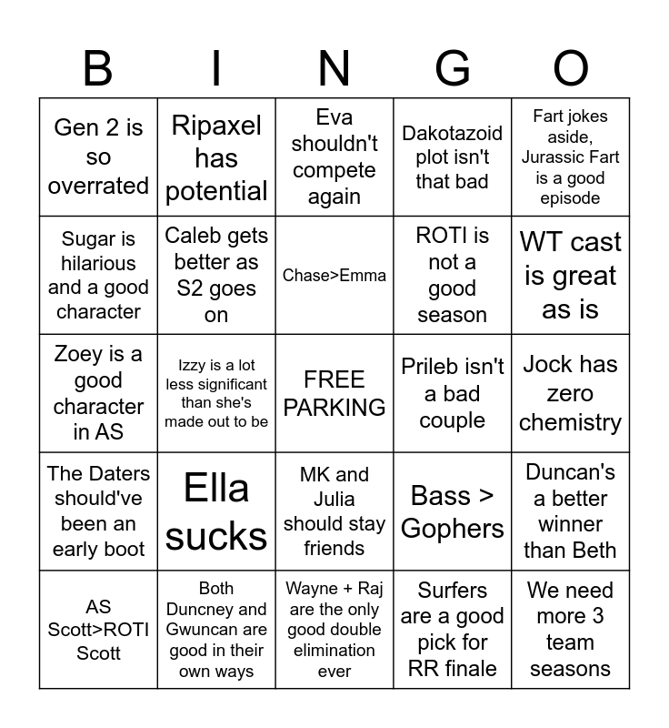 This bingo card has a free space and 24 words: Ella sucks, Both Duncney and Gwuncan are good in their own ways, Chase>Emma, AS Scott>ROTI Scott, Fart jokes aside, Jurassic Fart is a good episode, Gen 2 is so overrated, Sugar is hilarious and a good character, Ripaxel has potential, Prileb isn't a bad couple, MK and Julia should stay friends, ROTI is not a good season, Zoey is a good character in AS, Bass > Gophers, Duncan's a better winner than Beth, Caleb gets better as S2 goes on, Surfers are a good pick for RR finale, Jock has zero chemistry, Eva shouldn't compete again, WT cast is great as is, Izzy is a lot less significant than she's made out to be, We need more 3 team seasons, The Daters should've been an early boot, Dakotazoid plot isn't that bad and Wayne + Raj are the only good double elimination ever.