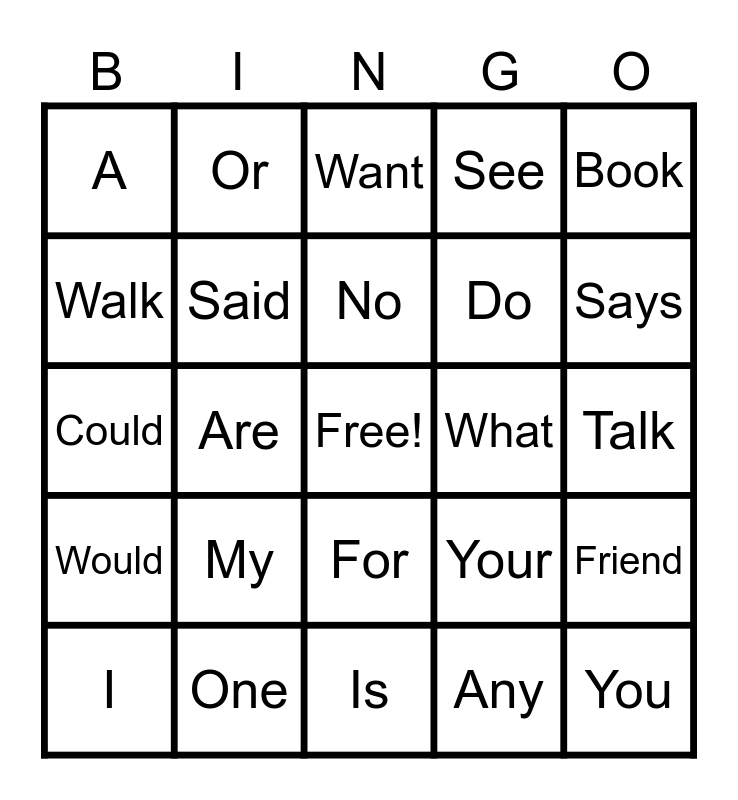 This bingo card has a free space and 56 words: The, I, And, A, Is, As, Said, To, Do, Of, See, He, Be, Me, From, Look, Book, Are, Was, You, What, Have, Your, Want, Go, No, So, Goes, Says, She, We, They, Their, Were, Talk, Walk, Could, Should, Would, Or, For, There, Where, Who, By, My, One, Once, Two, Does, Any, Many, Been, Into, Friend and Because.