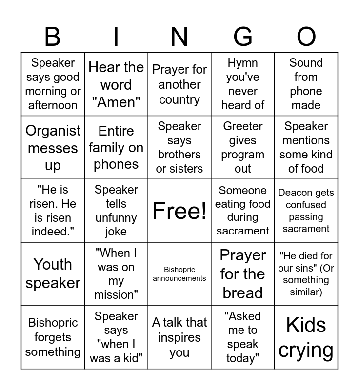 This bingo card has a free space and 24 words: "When I was on my mission", Speaker says "when I was a kid", Speaker says brothers or sisters, Bishopric forgets something, Sound from phone made, Speaker says good morning or afternoon, Organist messes up, Hear the word "Amen", Someone eating food during sacrament, Bishopric announcements, Greeter gives program out, "He is risen. He is risen indeed.", Prayer for the bread, "He died for our sins" (Or something similar), Entire family on phones, "Asked me to speak today", Deacon gets confused passing sacrament, Prayer for another country, Speaker mentions some kind of food, Speaker tells unfunny joke, Kids crying, Youth speaker, Hymn you've never heard of and A talk that inspires you.