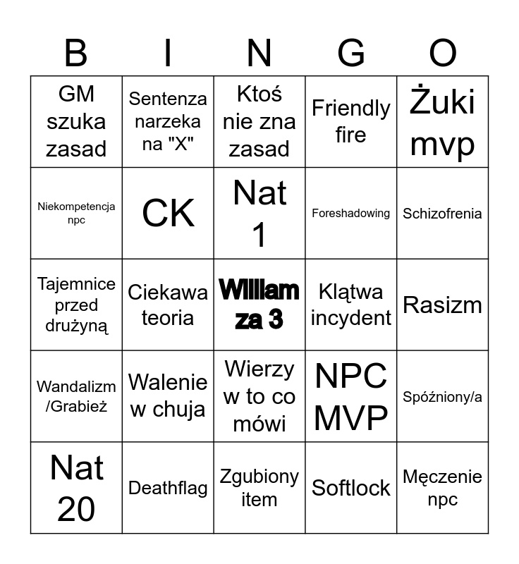 This bingo card has a free space and 24 words: Walenie w chuja, Deathflag, Nat 1, Nat 20, Żuki mvp, GM szuka zasad, Niekompetencja npc, Sentenza narzeka na "X", Klątwa incydent, Wierzy w to co mówi, Foreshadowing, Tajemnice przed drużyną, NPC MVP, Spóźniony/a, CK, Softlock, Rasizm, Ktoś nie zna zasad, Schizofrenia, Ciekawa teoria, Męczenie npc, Wandalizm /Grabież, Friendly fire and Zgubiony item.
