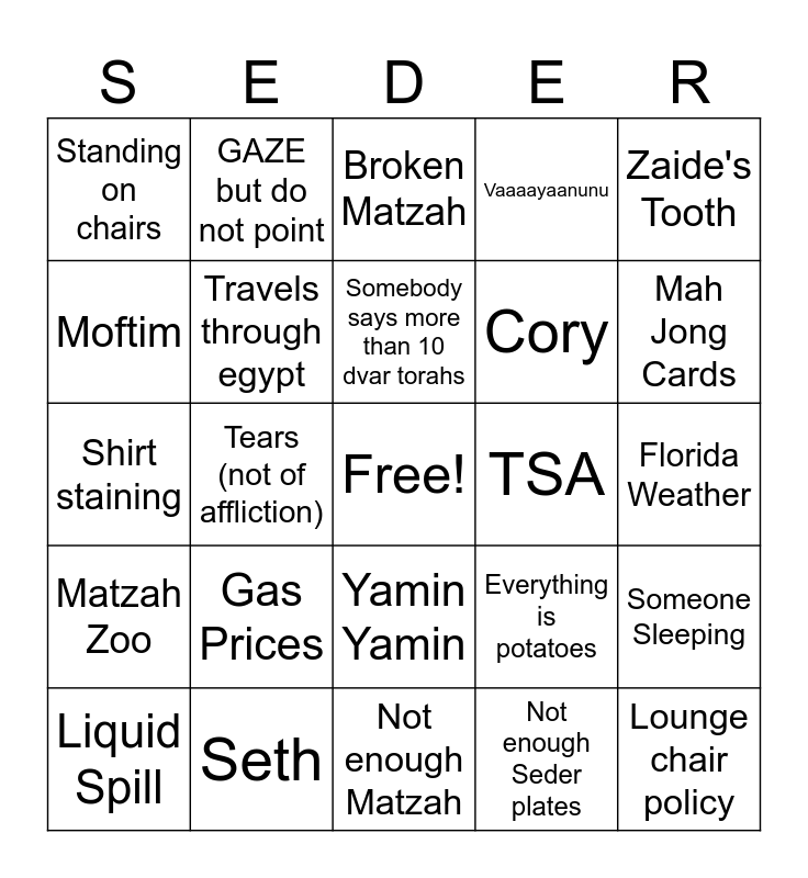 This bingo card has a free space and 29 words: Liquid Spill, Cartwheels, Tears (not of affliction), אם הבנים שמחה, Standing on chairs, Broken Matzah, Travels through egypt, Gas Prices, TSA, Seth, Florida Weather, Lounge chair policy, Not enough Matzah, Not enough Seder plates, Mah Jong Cards, Who's doing the Mah Nishtana, Yamin Yamin, Matzah Zoo, Zaide's Tooth, Shirt staining, Everything is potatoes, Jarrett/Carrot, Cory, Moftim, Vaaaayaanunu, GAZE but do not point, Someone Sleeping, Somebody says more than 10 dvar torahs and Somebody says a dvar torah for more than five mins.