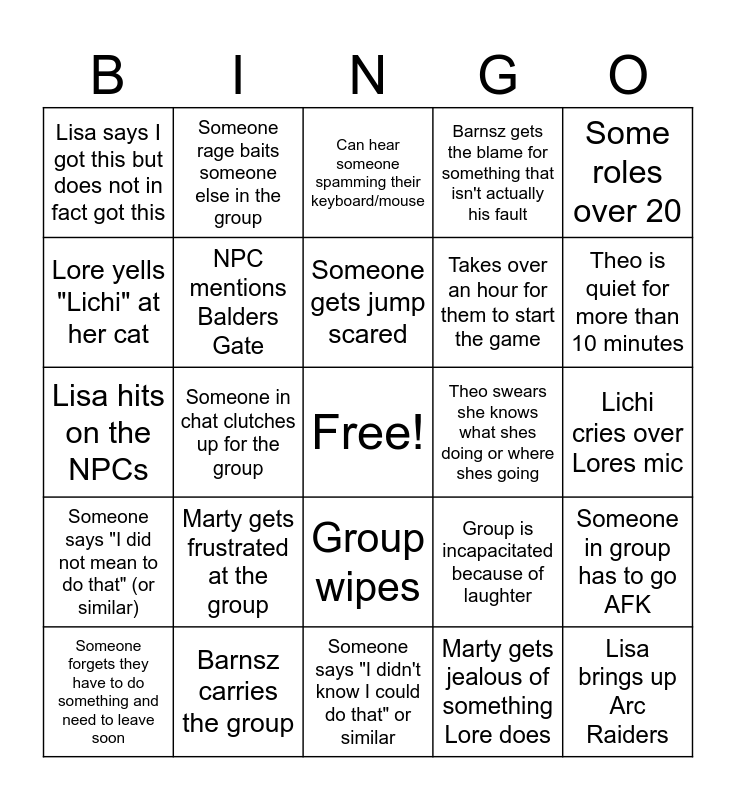 This bingo card has a free space and 34 words: Lisa and Lore flirt with each other, Marty gets jealous of something Lore does, Someone roles a 1, Someone gaslights someone else in the group, Someone says "I did not mean to do that" (or similar), NPC mentions Balders Gate, Some roles over 20, Someone forgets they have to do something and need to leave soon, Someone rage baits someone else in the group, Someone gets disgusted at an NPC, Someone gets jump scared, Can hear someone spamming their keyboard/mouse, Lore starts an event far away from anyone else, Someone says "sorry I was muted", Theo swears she knows what shes doing or where shes going, Theo is quiet for more than 10 minutes, Barnsz carries the group, Lisa hits on the NPCs, Marty gets frustrated at the group, Group is incapacitated because of laughter, Group wipes, Theo wonders off, Lisa says I got this but does not in fact got this, Lichi cries over Lores mic, Someone says "I didn't know I could do that" or similar, Lisa brings up Arc Raiders, Barnsz gets the blame for something that isn't actually his fault, Game goes for more than 2 hours, Takes over an hour for them to start the game, Lore yells "Lichi" at her cat, Lisa calls Lores cat "Mochi", Someone in chat clutches up for the group, Someone in group has to go AFK and group levels up!.