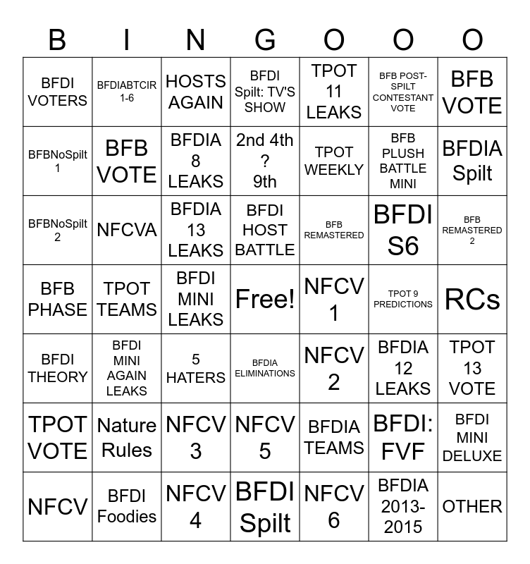 This bingo card has a free space and 48 words: BFDIA TEAMS, BFB PLUSH BATTLE MINI, BFDI Spilt, TPOT TEAMS, BFDIA 13 LEAKS, RCs, BFDIABTCIR 1-6, BFDI Foodies, BFB POST-SPILT CONTESTANT VOTE, BFDIA ELIMINATIONS, BFB VOTE, BFDI Spilt: TV'S SHOW, BFDI S6, BFB REMASTERED, TPOT VOTE, TPOT 9 PREDICTIONS, BFBNoSpilt 1, BFDIA Spilt, BFDI: FVF, TPOT 11 LEAKS, TPOT WEEKLY, BFDI MINI LEAKS, BFDI VOTERS, BFB VOTE, BFDI MINI DELUXE, BFDIA 8 LEAKS, BFB REMASTERED 2, NFCV, BFDI HOST BATTLE, NFCVA, BFDIA 2013-2015, NFCV 1, TPOT 13 VOTE, Nature Rules, BFB PHASE, NFCV 2, BFDIA 12 LEAKS, BFBNoSpilt 2, 5 HATERS, NFCV 3, BFDI THEORY, OTHER, HOSTS AGAIN, NFCV 4, 2nd 4th ? 9th, NFCV 5, BFDI MINI AGAIN LEAKS and NFCV 6.