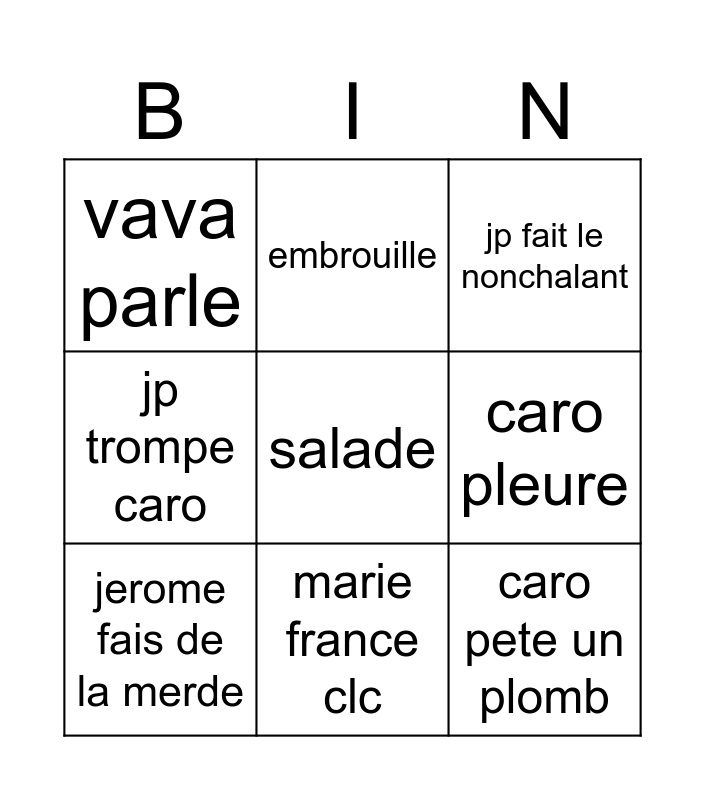 This bingo card has a free space and 8 words: caro pleure, jp fait le nonchalant, embrouille, jerome fais de la merde, vava parle, caro pete un plomb, jp trompe caro and marie france clc.
