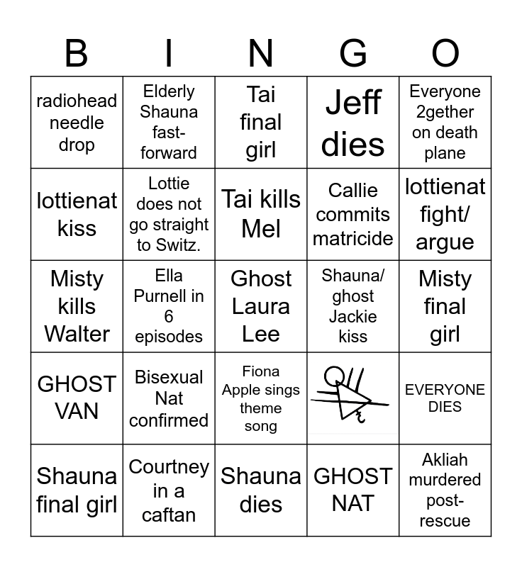 This bingo card has 1 images and 24 words: Bisexual Nat confirmed, Shauna dies, Tai kills Mel, Shauna final girl, Everyone 2gether on death plane, radiohead needle drop, lottienat kiss, Elderly Shauna fast-forward, Shauna/ ghost Jackie kiss, Fiona Apple sings theme song, Callie commits matricide, Misty kills Walter, EVERYONE DIES, Lottie does not go straight to Switz., Akliah murdered post-rescue, Misty final girl, Tai final girl, lottienat fight/ argue, Ella Purnell in 6 episodes, Ghost Laura Lee, Courtney in a caftan, GHOST VAN, Jeff dies and GHOST NAT.