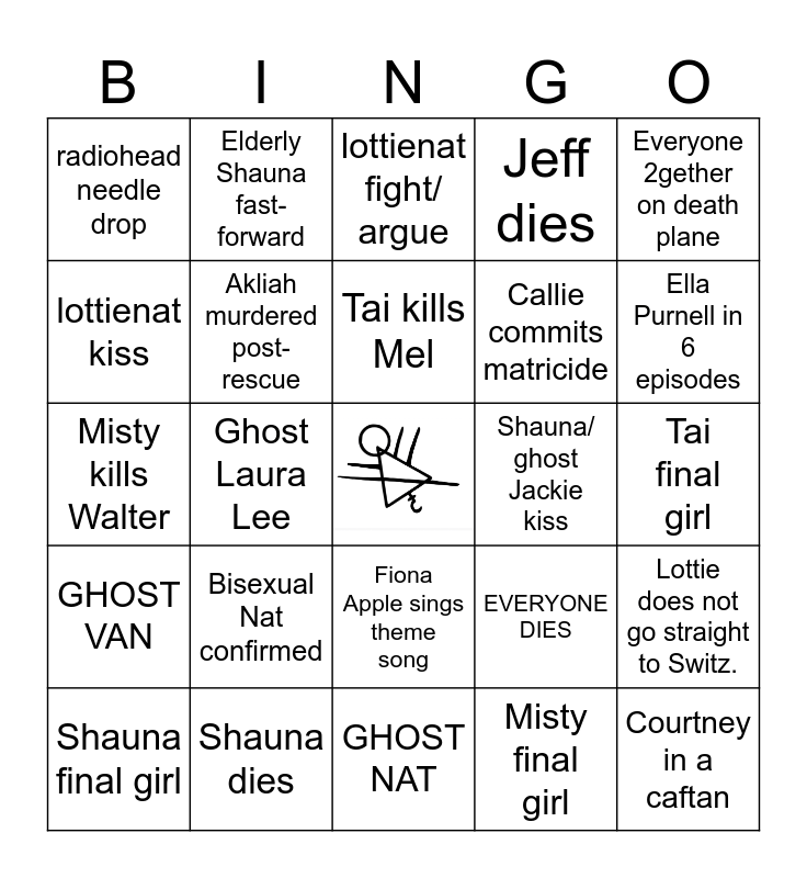 This bingo card has a free space and 24 words: Bisexual Nat confirmed, Shauna dies, Tai kills Mel, Shauna final girl, Everyone 2gether on death plane, radiohead needle drop, lottienat kiss, Elderly Shauna fast-forward, Shauna/ ghost Jackie kiss, Fiona Apple sings theme song, Callie commits matricide, Misty kills Walter, EVERYONE DIES, Lottie does not go straight to Switz., Akliah murdered post-rescue, Misty final girl, Tai final girl, lottienat fight/ argue, Ella Purnell in 6 episodes, Ghost Laura Lee, Courtney in a caftan, GHOST VAN, Jeff dies and GHOST NAT.