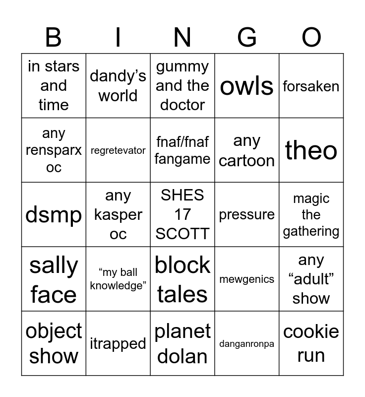 This bingo card has a free space and 24 words: “my ball knowledge”, itrapped, fnaf/fnaf fangame, object show, forsaken, in stars and time, any rensparx oc, dandy’s world, pressure, block tales, any cartoon, dsmp, mewgenics, any “adult” show, regretevator, danganronpa, magic the gathering, gummy and the doctor, theo, any kasper oc, cookie run, sally face, owls and planet dolan.