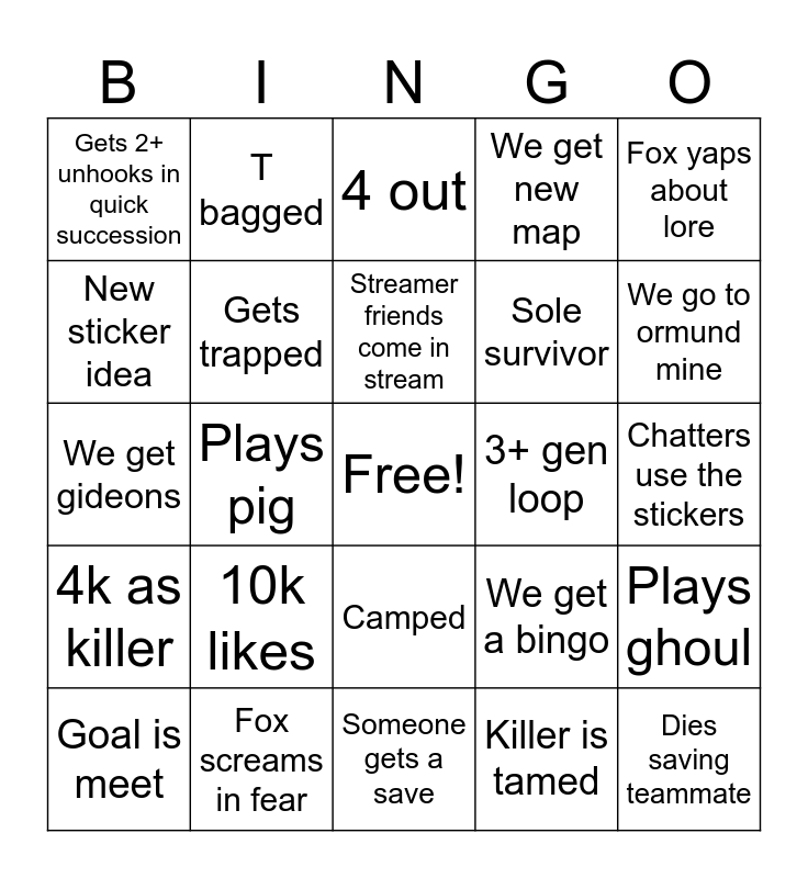 This bingo card has a free space and 24 words: 10k likes, Fox screams in fear, Streamer friends come in stream, Goal is meet, Fox yaps about lore, Gets 2+ unhooks in quick succession, New sticker idea, T bagged, 3+ gen loop, Camped, Sole survivor, We get gideons, We get a bingo, Plays ghoul, Gets trapped, Killer is tamed, Chatters use the stickers, 4 out, We go to ormund mine, Plays pig, Dies saving teammate, 4k as killer, We get new map and Someone gets a save.